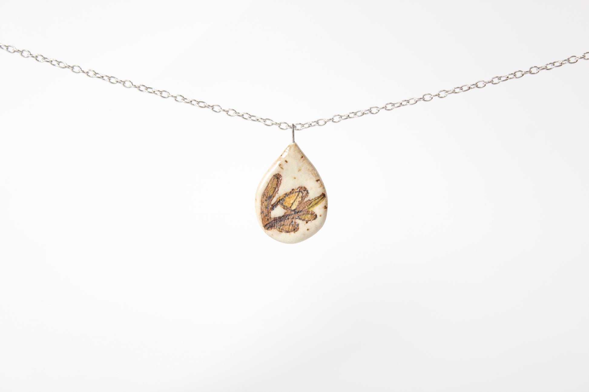 Ceramic pendant with 18 or 24 inch stainless steel cable chain with lobster clasp.