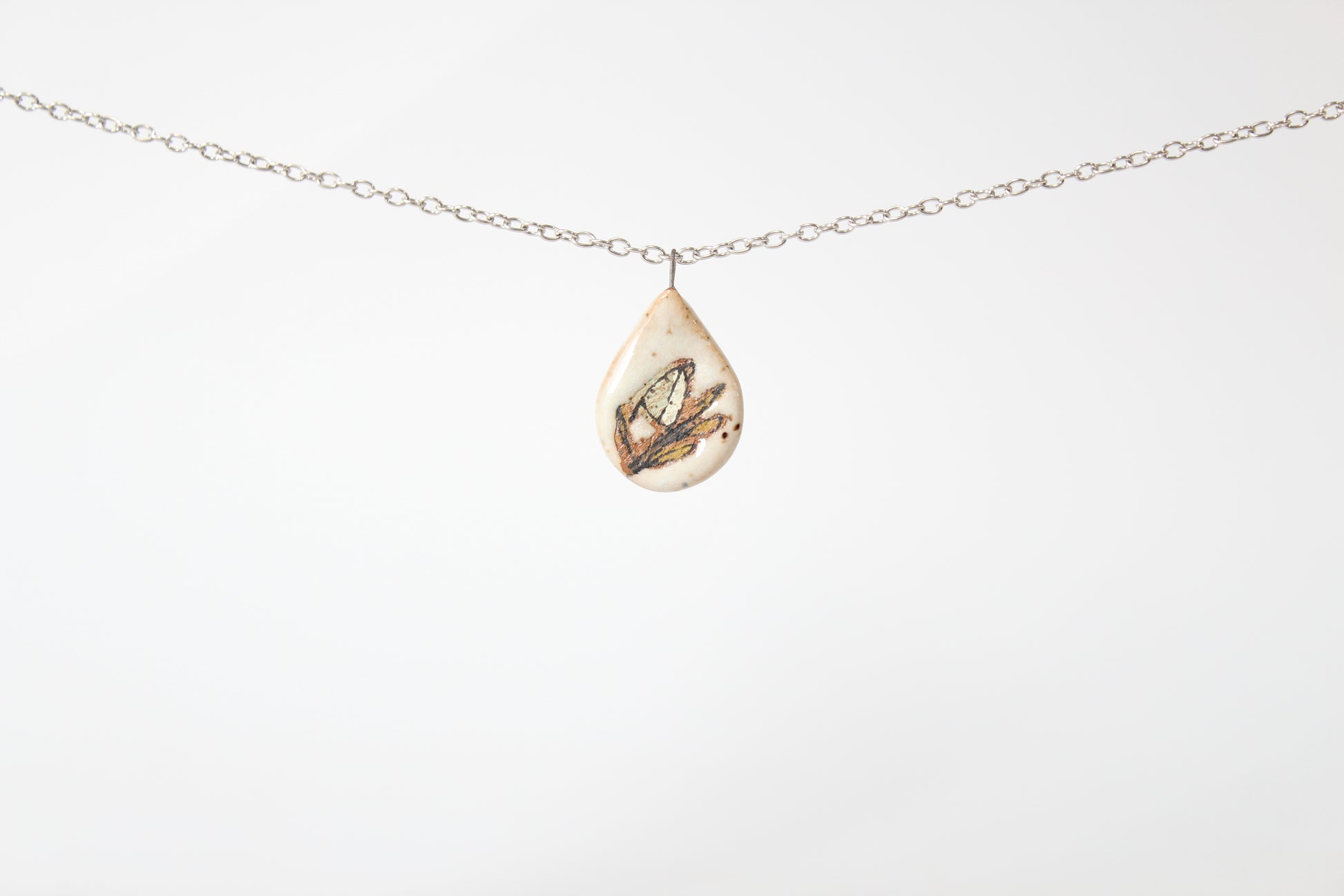 Ceramic pendant with an 18 or 24 inch stainless steel cable chain with lobster clasp.
