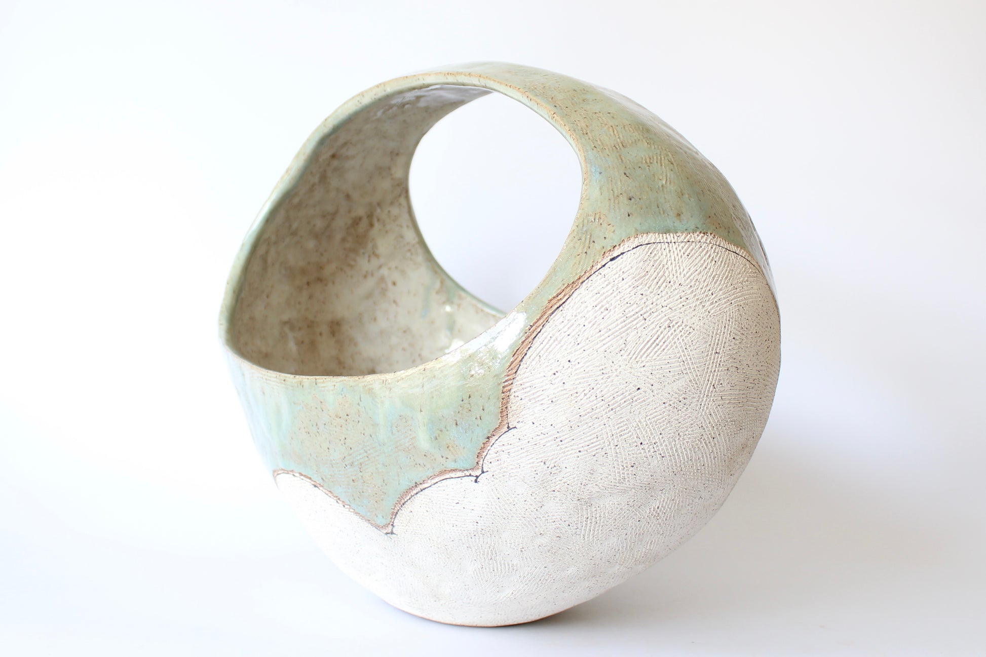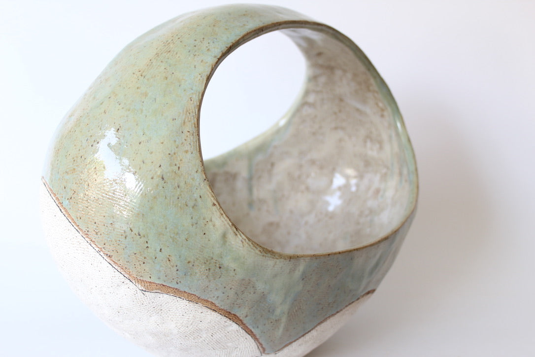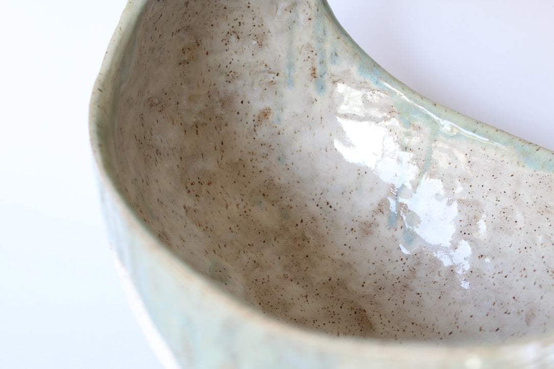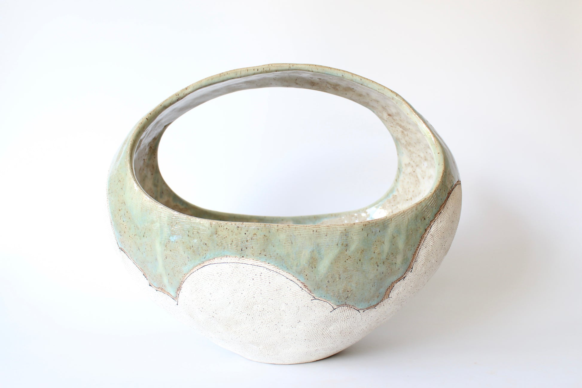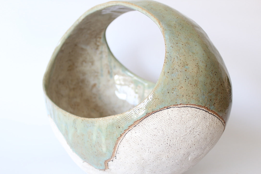 000. Large Hand Built Cloud Basket Bowl with Turquoise Glaze. 17"w x 10.5"d x 13"h